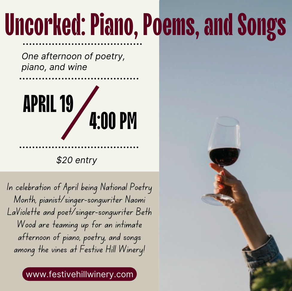 In celebration of April being National Poetry Month, pianist/singer-songwriter Naomi LaViolette and poet/singer-songwriter Beth Wood are teaming up for an intimate afternoon of piano, poetry, and songs among the vines at Festive Hill Winery! Naomi and Beth discovered the delicious alchemy of combining Naomi's calming, peaceful solo piano compositions (under the name Lucente Skye) with Beth's moving and grounding poetry, and they can't wait to share it with you! They will share these collaborations for the first set and then put on their singer-songwriter hats for a set of songs, stories, and harmonies.